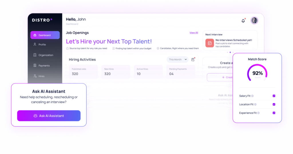 Stay lean while scaling smart. Distro automates the vetting, screening, and scheduling process so you can efficiently identify and interview qualified candidates—wherever they are.